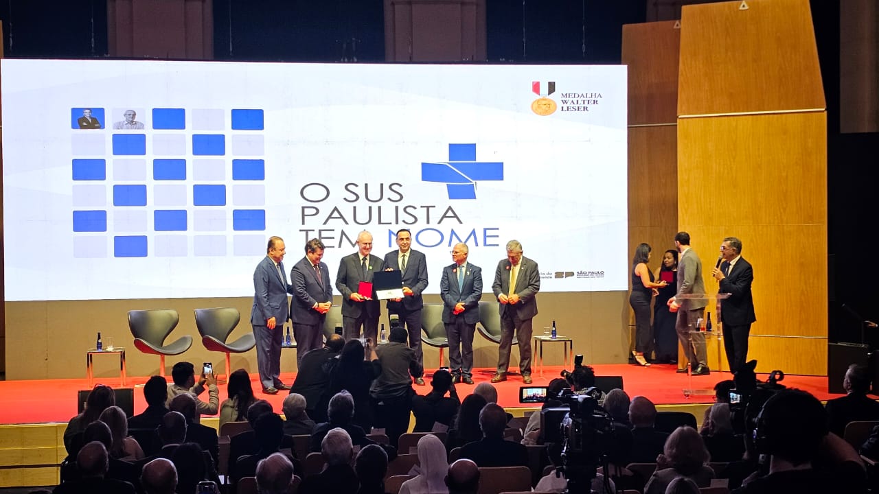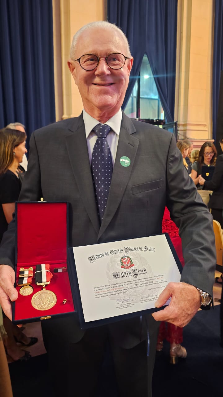 O professor Antonio Rugolo Junior, médico, superintendente de Atenção à Saúde da Fundação para o Desenvolvimento Médico e Hospitalar (Famesp) e ex-diretor-presidente da Fundação, recebeu na noite de 18 de novembro, em cerimônia realizada na Sala São Paulo, na capital paulista, a medalha de honra e mérito da gestão pública em saúde “Walter Leser”, concedida pelo Governo do Estado de São Paulo.