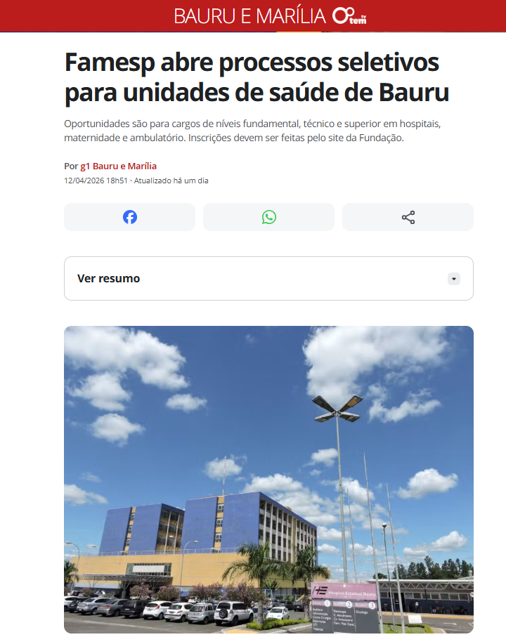 Disponível em: https://g1.globo.com/sp/bauru-marilia/noticia/2026/04/12/famesp-abre-processos-seletivos-para-unidades-de-saude-de-bauru.ghtml